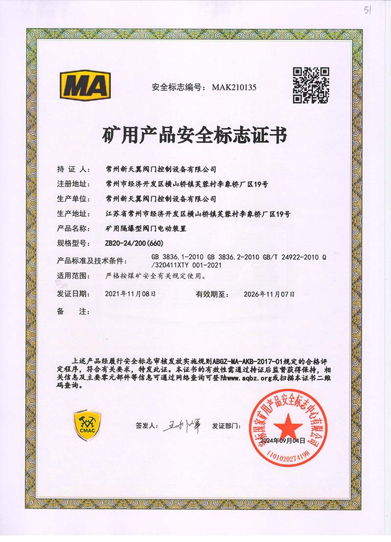 礦用隔爆ZB10-24中國國家強制性產品認證證書110.2